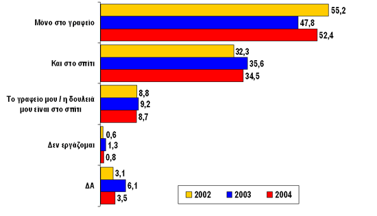 (Απαντούν όσοι χρησιμοποιούν Η/Υ για εργασία, 2002: Ν = 310 άτομα, 2003: Ν = 384 άτομα, 2004: Ν = 345 άτομα)