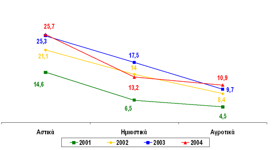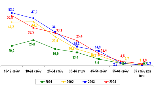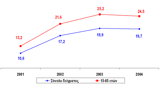 (Σύνολο δείγματος, 2001: 6090 άτομα, 2002: 2461 άτομα, 2003: 2802 άτομα, 2004: 2804 άτομα)