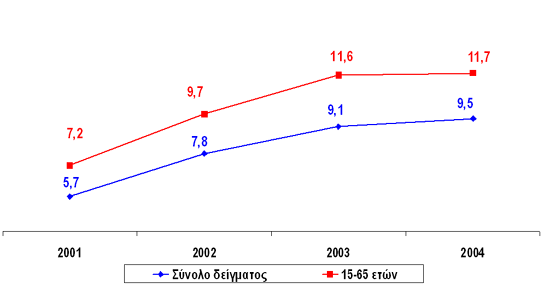 (Αναγωγή στο σύνολο του δείγματος, 2001: Ν = 6090 άτομα, 2002: Ν = 2461 άτομα, 2003: Ν = 2802 άτομα, 2004: Ν = 2804 άτομα)