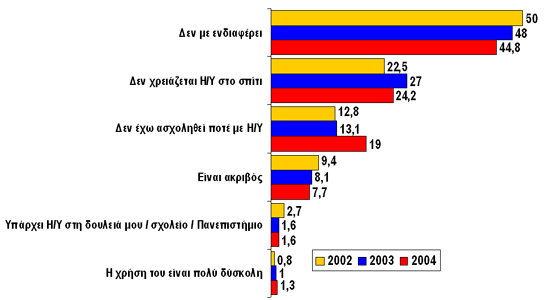 (Απαντούν όσοι δεν σκοπεύουν να αποκτήσουν Η/Υ στο σπίτι, 2002: Ν = 1520 νοικοκυριά, 2003: Ν = 1657 νοικοκυριά, 2004: Ν = 1759 νοικοκυριά)