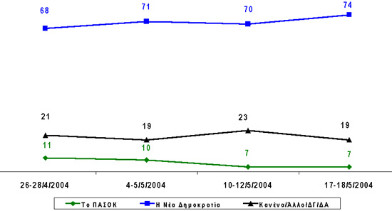 Περίοδος Έρευνας: 17 έως 18 Μαίου 2004 Ανάθεση: Εφημερίδα "ΚΑΘΗΜΕΡΙΝΗ" & Ραδιοφωνικός Σταθμός "ΣΚΑΪ" Πληθυσμός: 18 ετών και άνω, με εκλογικό δικαίωμα Δείγμα: Το σχεδιασθέν μέγεθος του δείγματος ανέρχεται σε 1.200 άτομα ανά κύμα Περιοχή: Το σύνολο της χώρας (πανελλήνια έρευνα) Τύπος: ΠΟΣΟΤΙΚΕΣ ΕΡΕΥΝΕΣ, με τηλεφωνικές συνεντεύξεις στα νοικοκυριά των ερωτωμένων και χρήση δομημένου ερωτηματολογίου, χωρίς κάλπη Μέθοδος: Ακολουθείται η μέθοδος της στρωματοποιημένης δειγματοληψίας. Τα στρώματα της έρευνας αποτελούν οι διοικητικές περιφέρειες της χώρας, συμπεριλαμβανομένων των νήσων Αιγαίου και Ιονίου |